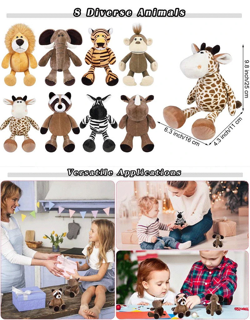 Cute gifts: These neutral jungle animal Stuffed toy are special gifts for animal themed parties, birthdays, baptisms, Easter, Valentine's Day, etc. In addition, these toys are Vacuum packing, so you can stay untouched for a long time until you return to the original state after receiving them.
